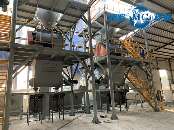 該生產(chǎn)線(xiàn)主要由原料儲(chǔ)存系統(tǒng)、配料稱(chēng)重系統(tǒng)、輸送系統(tǒng)、混合系統(tǒng)、氣相平衡系統(tǒng)、包裝系統(tǒng)及除塵系統(tǒng)構(gòu)成。主控制系統(tǒng)依據(jù)選定工藝配方下達(dá)生產(chǎn)指令,系統(tǒng)自動(dòng)從儲(chǔ)料倉(cāng)中按配比提取原料,原料經(jīng)配重后依次進(jìn)入待混倉(cāng)及無(wú)重力高效混合機(jī),實(shí)現(xiàn)快速混合作業(yè)(3-5分鐘)。達(dá)到混合精度要求后,成品砂漿被輸送至具備二次混合功能的成品倉(cāng),進(jìn)入自動(dòng)包裝系統(tǒng),大大提高產(chǎn)出效率。